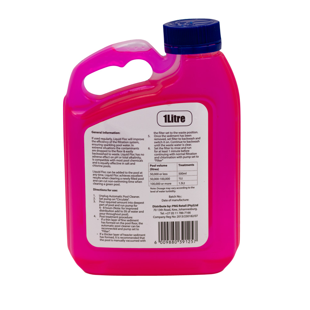 If used regularly, Liquid Floc will improve the efficiency of the filtration system, ensuring sparkling pool water. In extreme situations the contaminants are dropped to the floor and easily backwashed to waste.