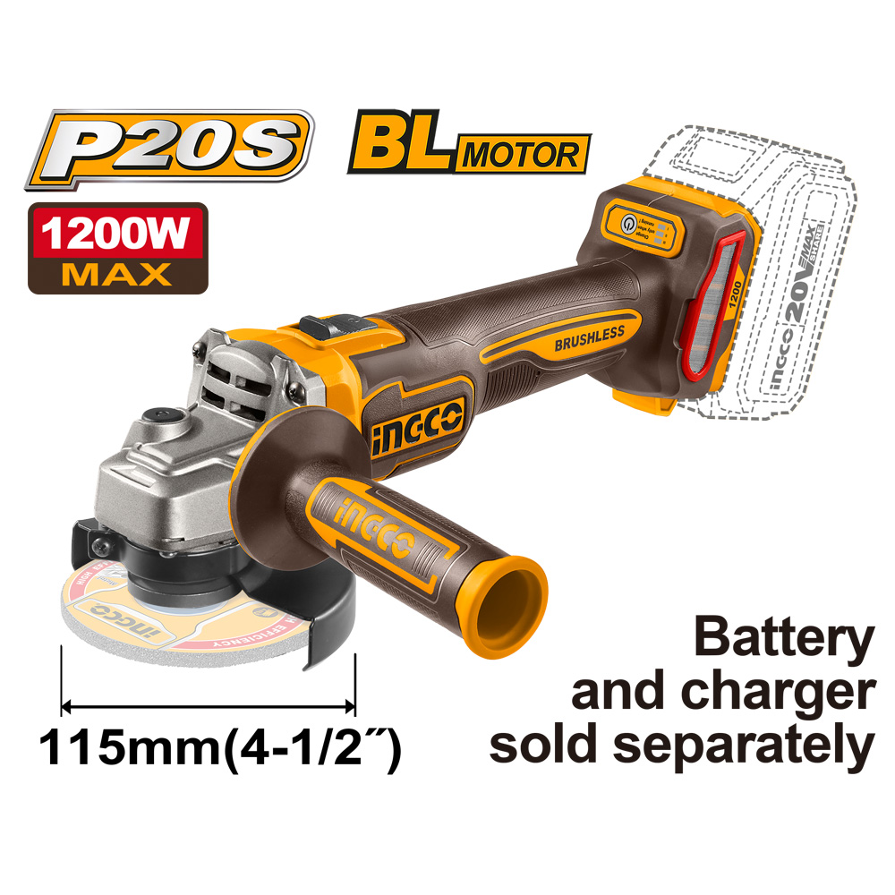 / Ingco Cordless 20V Lithium-Ion Angle Grinder 3 Speed Brushless 115mm 1200W CAGLI221153